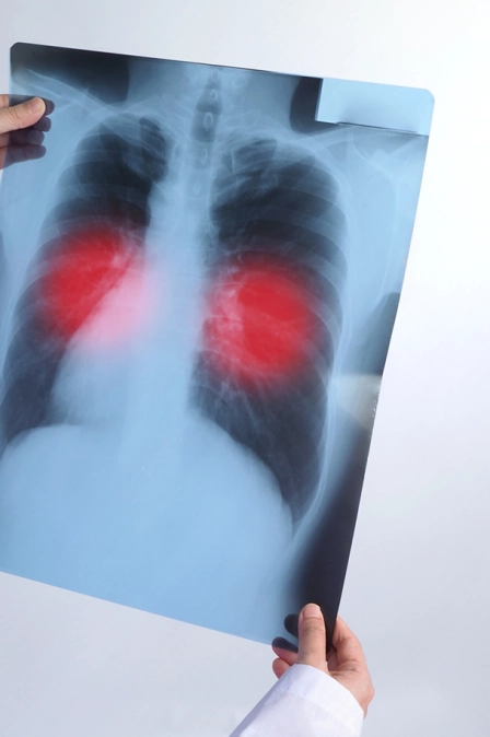 2. Рентгенография грудной клетки помогает определить воспалительные изменения в лёгочной ткани. Это главный способ визуализации.